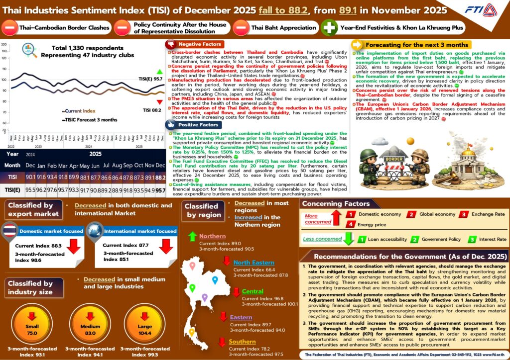 ดัชนีความเชื่อมั่นภาคอุตสาหกรรม ประจำปี 2568 ดัชนีความเชื่อมั่นภาคอุตสาหกรรมเดือนธันวาคม 2568 Estimated reading: 1 minute 144 views ดัชนีความเชื่อมั่นฯ ในเดือนธันวาคม 2568 อยู่ที่ระดับ 88.2 ปรับตัวลดลง จาก 89.1 ในเดือนพฤศจิกายน 2568 ขณะที่ดัชนีคาดการณ์ 3 เดือนข้างหน้าอยู่ที่ระดับ 95.7 ปรับตัวเพิ่มขึ้น จาก 94.9 ในเดือนพฤศจิกายน 2568 เมื่อพิจารณาองค์ประกอบของดัชนีความเชื่อมั่นภาคอุตสาหกรรม ในเดือนธันวาคม 2568 พบว่า องค์ประกอบส่วนใหญ่ปรับตัวลดลง ขณะที่ดัชนีคาดการณ์ 3 เดือนข้างหน้า องค์ประกอบส่วนใหญ่ปรับตัวเพิ่มขึ้น ในเดือนนี้มีปัจจัยลบจาก 1) เหตุปะทะบริเวณชายแดนไทย-กัมพูชา 2) ความกังวลด้านความต่อเนื่องการดำเนินนโยบายของรัฐบาลหลังมีการประกาศยุบสภา 3) การผลิตภาคอุตสาหกรรมลดลง 4) สถานการณ์ฝุ่นละออง PM2.5 ในหลายพื้นที่ อย่างไรก็ตาม ยังมีปัจจัยบวกจาก 1) การเข้าสู่ช่วงเทศกาลส่งท้ายปีและการเร่งใช้จ่ายโครงการคนละครึ่งพลัสก่อนสิ้นสุดวันที่ 31 ธ.ค. 2568 2) คณะกรรมการนโยบายการเงิน (กนง.) มีมติลดอัตราดอกเบี้ยนโยบาย 0.25% ต่อปี เป็น 1.25% ต่อปี 3) คณะกรรมการบริการกองทุนน้ำมันเชื้อเพลิง (กบน.) มีมติปรับลดอัตราเงินกองทุนน้ำมันดีเซลลง 20 สตางค์/ลิตร 4) มาตรการช่วยเหลือค่าครองชีพ อาทิ เงินเยียวยาผู้ประสบอุทกภัย เงินช่วยเหลือชาวนา ดาวน์โหลดไฟล์ข้อมูล ⇓Info ดัชนีฯ ธันวาคม 2568 (คลิก)Info TISI DEC 2025 (คลิก)PPT แถลงข่าวดัชนีฯ ธันวาคม 2568 (คลิก)Paper ดัชนีฯ ธันวาคม 2568 (คลิก) Next - ดัชนีความเชื่อมั่นภาคอุตสาหกรรม ประจำปี 2568 ดัชนีความเชื่อมั่นภาคอุตสาหกรรมเดือนพฤศจิกายน 2568