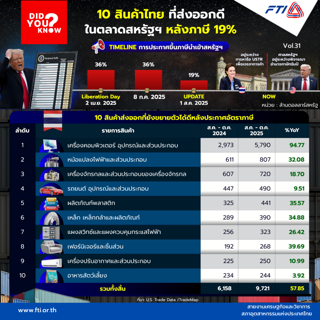 FTI Knowledge Sharing Vol.30 10 สินค้าไทย ที่ส่งออกดีในตลาดสหรัฐฯ หลังภาษี 19% Estimated reading: 1 minute 61 views 📍Did you know?ภายใต้กำแพงภาษีนำเข้า 19% สินค้าไทยยังคง แข็งแกร่งและเป็นที่ต้องการ ในช่วง 3 เดือน (ส.ค.-ต.ค. 2025) มูลค่าการส่งออก 10 สินค้าหลักไปสหรัฐฯ พุ่งสูงแตะ 9,721 ล้านดอลลาร์สหรัฐฯ ขยายตัวรวมกว่า 57.85% 🚨📈 สินค้าดาวรุ่งพุ่งแรง (%YoY)เครื่องคอมพิวเตอร์และอุปกรณ์ (+94.77%), เฟอร์นิเจอร์และชิ้นส่วน (+39.69%), ผลิตภัณฑ์พลาสติก (+35.57%), เหล็กและเหล็กกล้า (+34.88%), หม้อแปลงไฟฟ้า (+32.08%)📉 ปัจจัยเสี่ยงที่ต้องติดตามTimeline การเปลี่ยนแปลงอัตราภาษีที่มีความผันผวน และผลการพิจารณาอำนาจภาษีของศาลสหรัฐฯ รวมถึงการหารือของ USTR ซึ่งเป็นปัจจัยภายนอกที่ผู้ประกอบการต้องเตรียมแผนรับมือความไม่แน่นอน🇹🇭 ตัวเลขการเติบโตนี้ชี้ให้เห็นว่า สินค้ากลุ่มเทคโนโลยีและวัสดุอุตสาหกรรม (คอมพิวเตอร์, เหล็ก, เครื่องจักร) ของไทย เข้าไปเป็นส่วนสำคัญในห่วงโซ่อุปทาน (Supply Chain) ของสหรัฐฯ ได้อย่างเหนียวแน่น สวนทางกับมาตรการกีดกันทางการค้า สะท้อนศักยภาพการผลิตไทยที่ยังคงแข่งขันได้ในตลาดโลก🏅การรักษามาตรฐานสินค้าสากล และความสามารถในการปรับตัวที่ยืดหยุ่นของผู้ประกอบการ คือเกราะป้องกันสำคัญที่ทำให้ภาคการส่งออกไทยยังขยายตัวได้ ท่ามกลางสมรภูมิการค้าที่เปลี่ยนแปลง📖 ที่มา: U.S. Trade Data / TradeMap#FTIKnowledgeSharing #USMarket #ThaiExport #Tariffs #เศรษฐกิจ #การส่งออก #สายงานเศรษฐกิจและวิชาการ #สภาอุตสาหกรรมแห่งประเทศไทย Next - FTI Knowledge Sharing Vol.29 ส่อง 8 ผลิตภัณฑ์ชีวภาพ ต่อยอดจุดแข็งด้าน Biodiversity ไทย